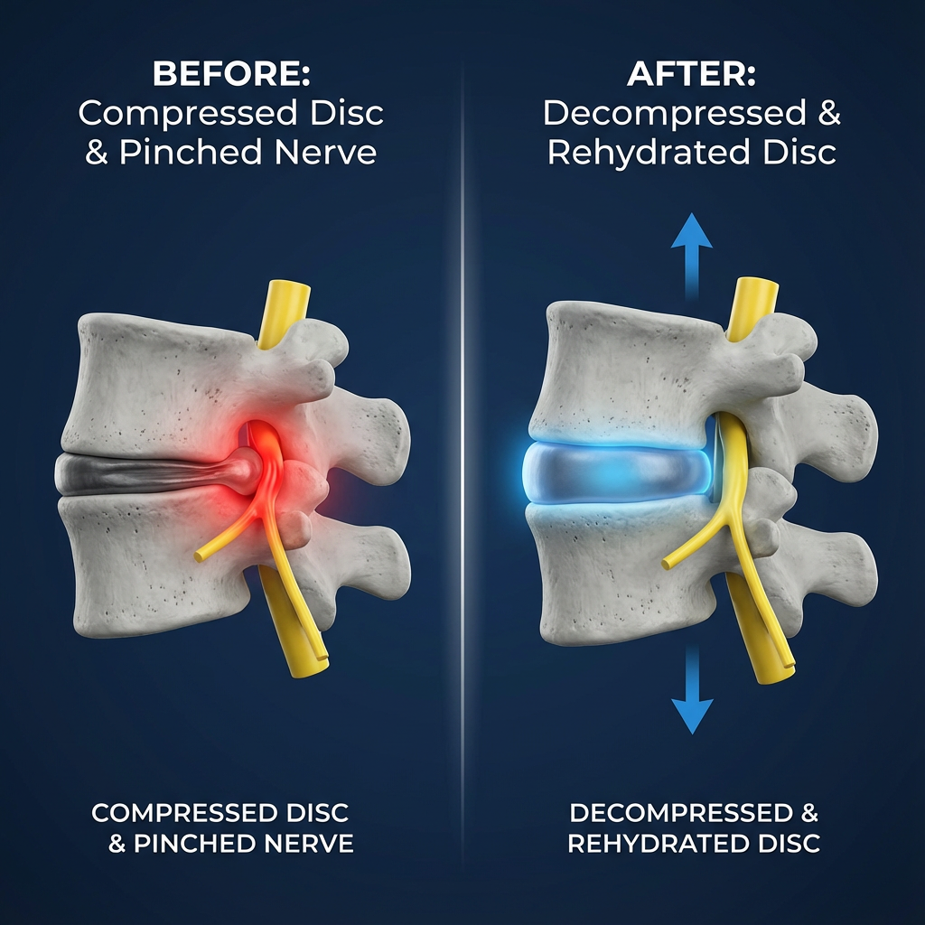 Your discs dry out from decades of compression (sitting, driving, slouching). Once dehydrated, they collapse crushing your sciatic nerve.